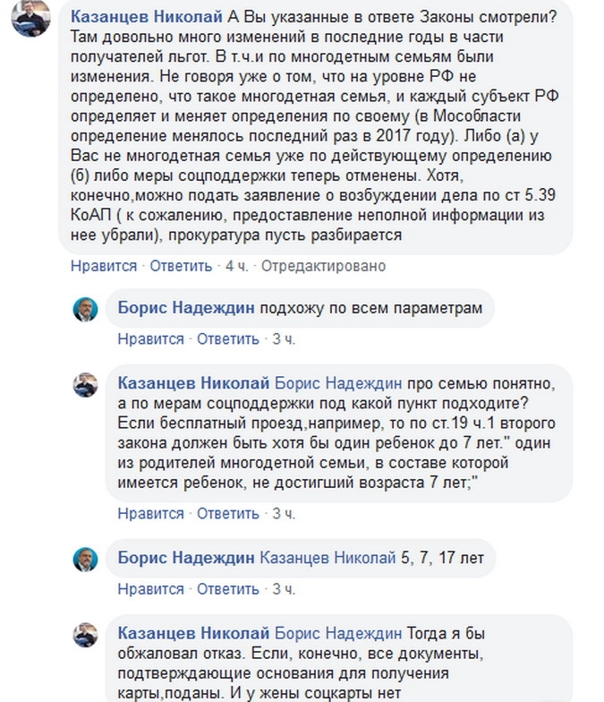 Между тем Борис Надеждин — отец троих несовершеннолетних детей (5, 7, 17 лет) и льготы как многодетному родителю ему положены по закону. То есть он так считал.