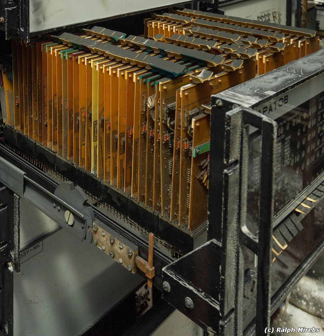 Дно было устлано корзинами позолоченных электрических разъёмов РППМ, в которые устанавливались небольшие электронные платки. Каждая была помечена цветной пластиковой шляпкой-рукояткой. Разные ящики отвечали на разнообразные узлы компьютера — двенадцати битный вычислительный блок, интерфейсы устройств ввода-вывода, оперативную память.