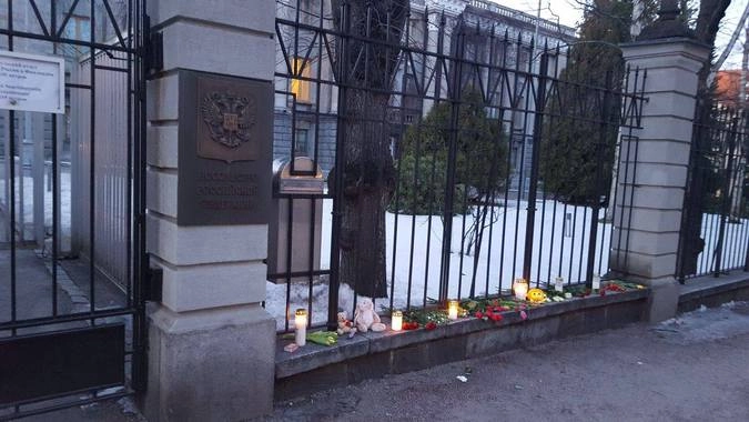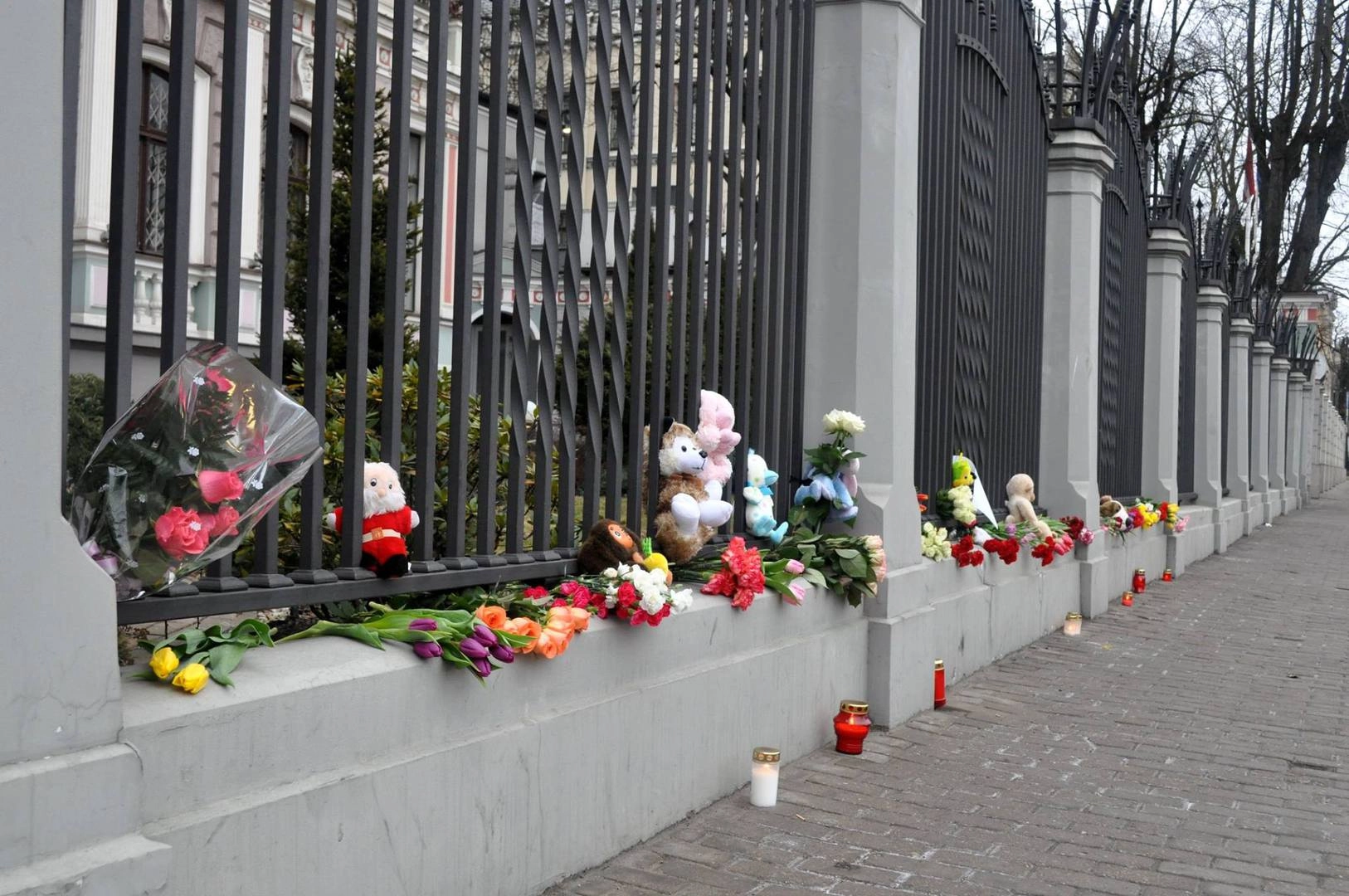 Подобная акция прошла и у посольства России в Латвии: к зданию дипмиссии в Риге второй день несут цветы, свечи и мягкие игрушки в память о жертвах пожара.