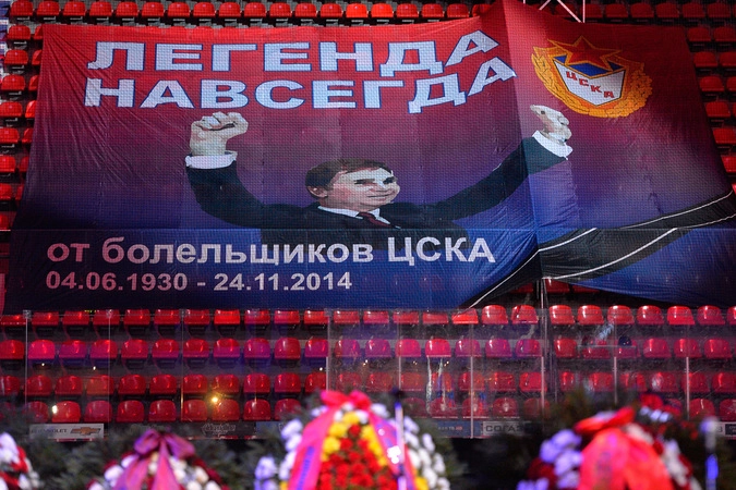 На фасаде здания — большая фотография Тихонова, где он на льду с клюшкой в руках во время тренировки, на одной из трибун — большой баннер с эмблемой ЦСКА, портретом Тихонова и словами: «Легенда навсегда». Хоккеисты-армейцы пришли отдать дань памяти первыми.
