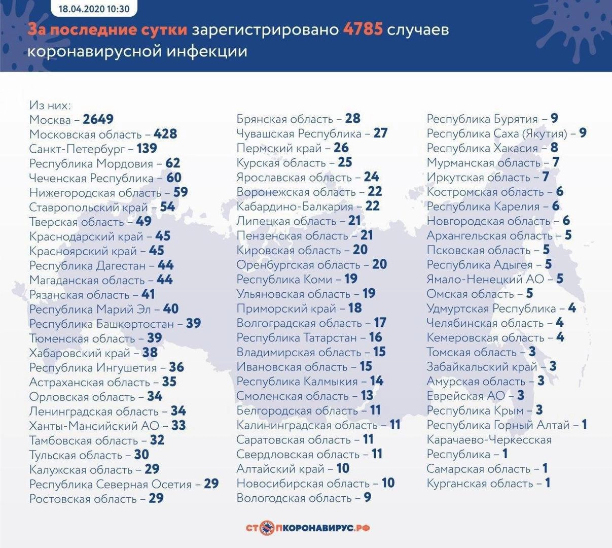 Согласно общероссийской статистике, всего на утро 18 апреля зарегистрировано 32 008 случаев Covid-19 в 85 регионах. Скончались 273 человека, выздоровели — 2590.