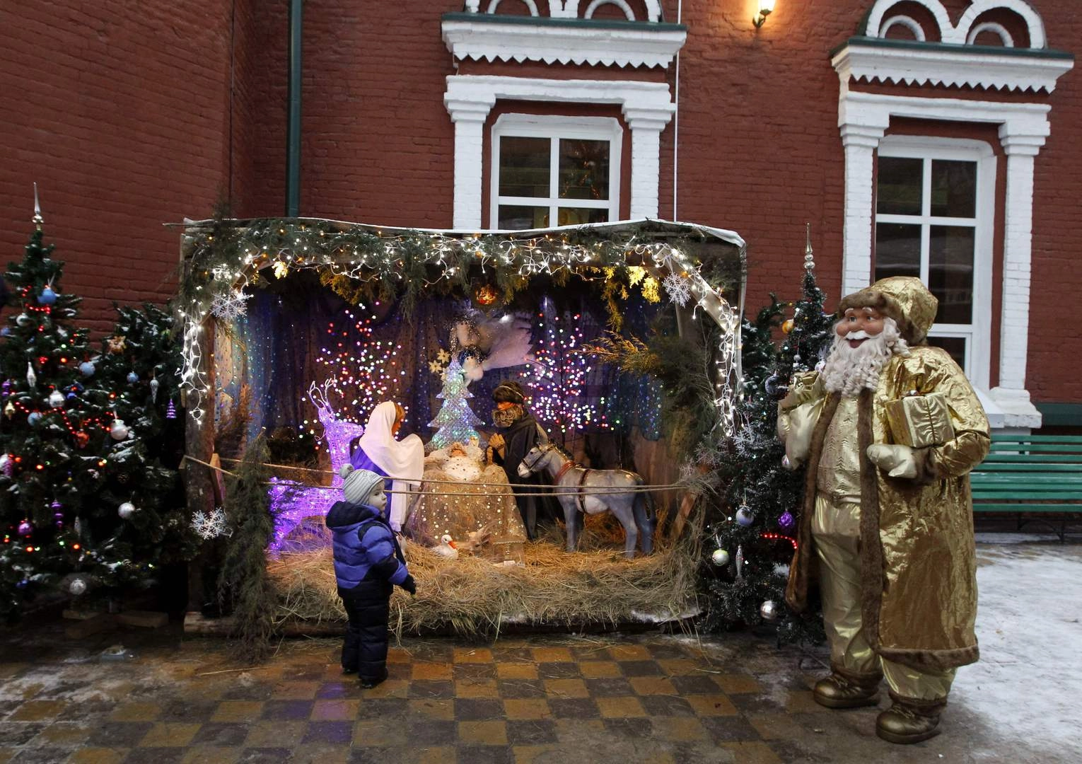 Ребенок стоит перед рождественским макетом в канун православного Рождества в Казанском соборе в Волгограде.