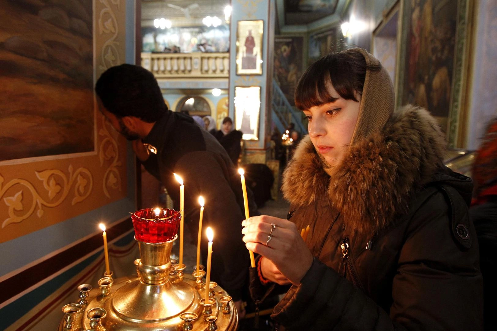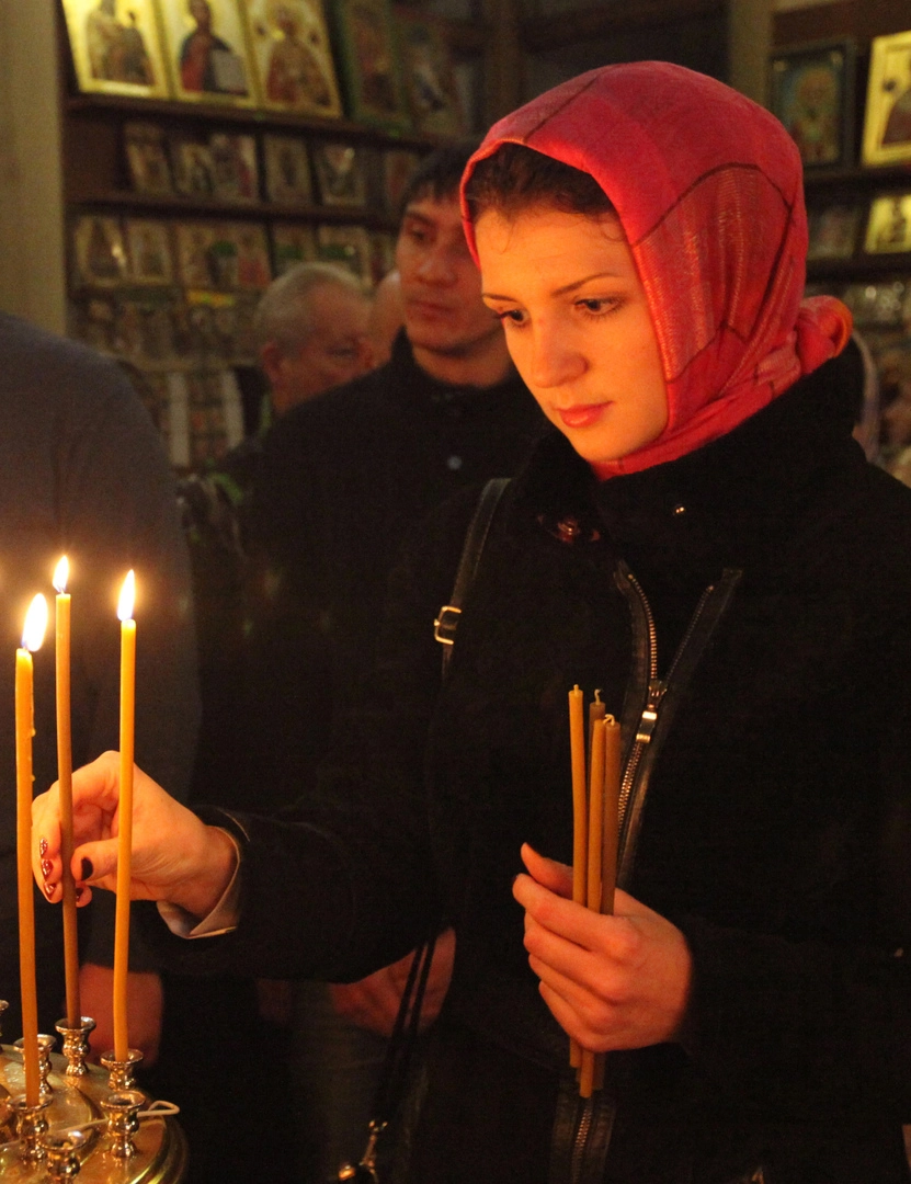 Женщина зажигает свечу перед службой накануне православного Рождества в Казанском соборе в Волгограде.