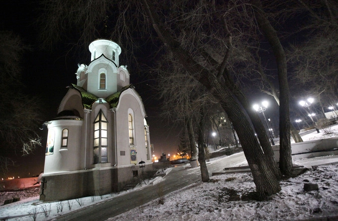 Храм-часовня Святого Андрея Первозванного во Владивостоке, перед началом праздничной Рожденственской службы.