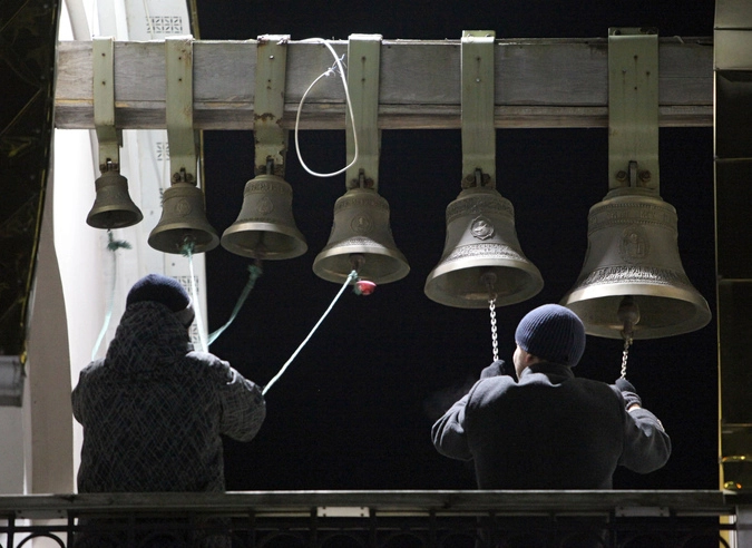 Звонари на колокольне храма-часовни Святого Андрея Первозванного во Владивостоке, где проходит рождественская служба.