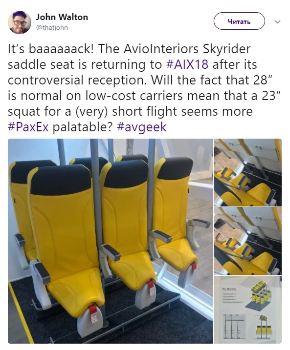 Фотографию разработки опубликовали в Twitter. Пользователи отнеслись к новинке неоднозначно. Некоторым понравилась идея удешевления билетов за счет таких «кресел», другие посчитали, что «короткий перелет — это одно дело, но если прибавить к нему время посадки и вылета… Как, черт возьми, выстоять столько времени возле этой штуковины?»