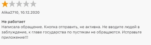 Наиболее распространенная тема для жалоб — неработающая кнопка «Отправить обращение», которая не позволяет пользователю сделать то, для чего приложение и предназначено. Многие отмечают, что даже если сообщение отправляется, то его статус не отображается, и пользователь должен гадать, дойдут его проблемы до президента или нет.