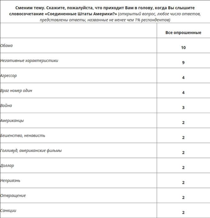 Россияне характеризуют Штаты в преимущественно негативном ключе: отрицательные высказывания различного рода относительно американцев (9%), неприязнь, отвращение, ненависть (по 2%) и др. США воспринимаются как агрессор (4%), «враг номер один» (4%), провокатор (2%), страна, стремящаяся к мировому господству (2%), ведущая антироссийскую политику (2%) и применяющая к нам санкции (2%) и так далее.