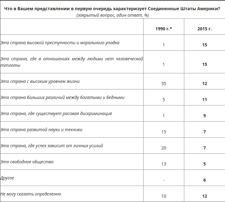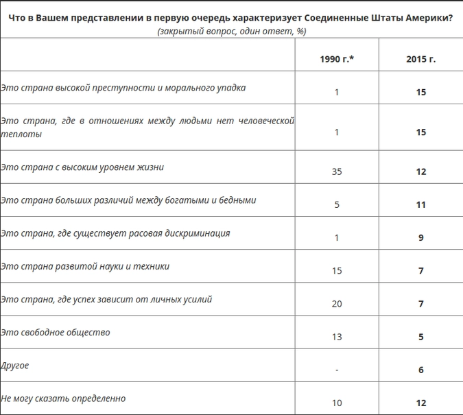 Следующие результаты социального исследования наглядно демонстрируют кардинальную смену отношения россиян к Штатам со времен перестройки: если в 1990 году США характеризовали в первую очередь как «государство с высоким уровнем жизни» (35%), то сегодня — как «страну высокой преступности и морального упадка» (15%). При этом большинство респондентов сходятся во мнении, что в США «в отношениях между людьми нет человеческой теплоты» (15%).