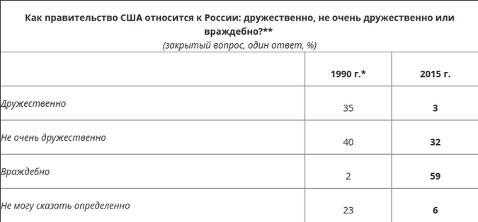 Кроме того, как выяснили социологи, у подавляющего числа россиян не осталось сомнений по поводу враждебности американского правительства к России. Правительство США воспринимается современными россиянами как резко враждебное России (59%). Для сравнения, в 1990 году американские власти, по словам трети респондентов (35%), были настроены доброжелательно по отношению к советскому государству.