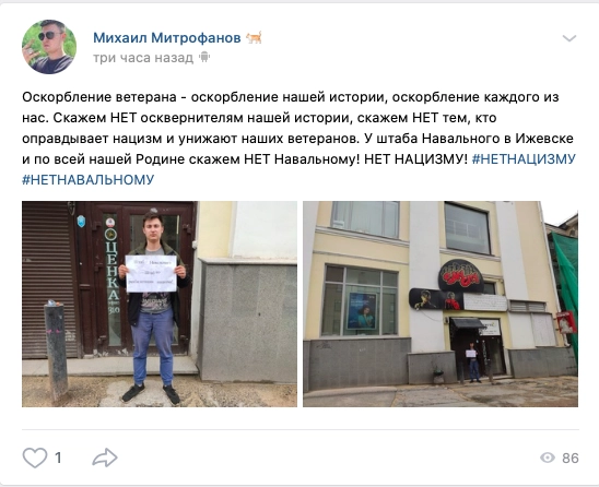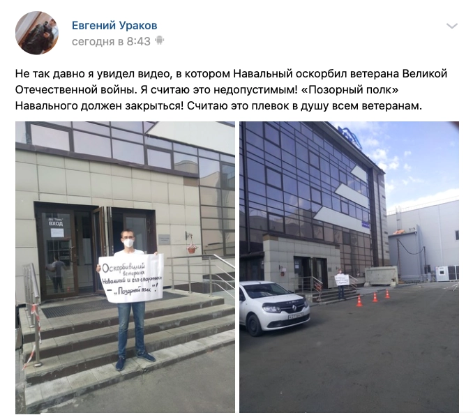 Россияне продолжают устраивать одиночные пикеты у региональных штабов Фонда борьбы с коррупцией (ФБК). Сегодня жители Костромы, Ижевска, Кемерово, Перми, Брянска и еще пяти городов вышли на улицы, чтобы потребовать от основателя ФБК Алексея Навального и его сторонников извиниться за оскорбление ветерана Великой Отечественной войны Игната Артеменко.