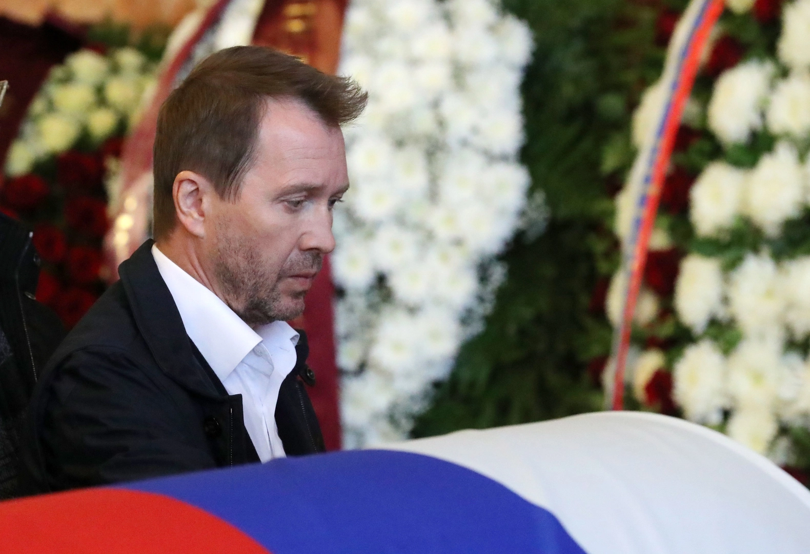 Одним из первых к гробу Леонова подошел губернатор Московской области Андрей Воробьев, отмечает телеканал.
