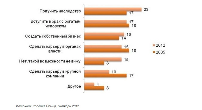 Доля сторонников такого мнения выросла с 17% в 2005 году. Все меньше становится людей, надеющихся разбогатеть благодаря успешной карьере. Зато немного подросла доля респондентов, уверенных в возможности укрепить свое благосостояние за счет собственного бизнеса - с 14% до 16%.