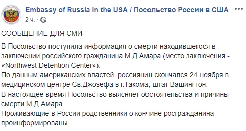 В США скончался находившийся в тюрьме гражданин России М. Д. Амар.