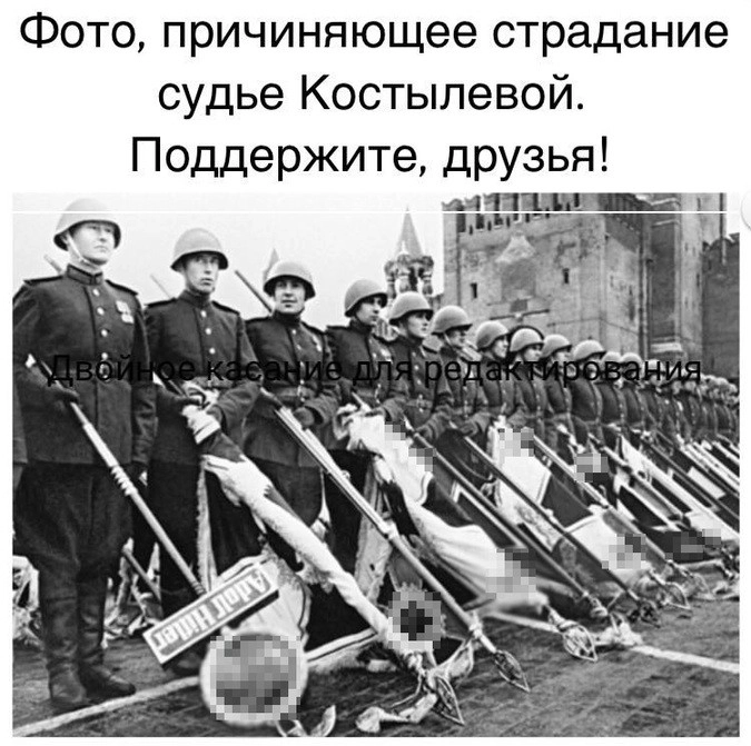 «Позорище! 19 января 2018 года гражданин России Михаил Листов был оштрафован решением судьи Елены Костылевой Исакогорского районного суда города Архангельска за публикацию вот этого фотоснимка Парада Победы над фашистской Германией 1945 года. Судья вынесла свое решение на основании ст. 20.3 КоАП, запрещающей демонстрацию нацистской символики и предполагающей наказание за подобное деяние в виде штрафа до двух тысяч рублей и ареста до 15 суток», — написал он.
