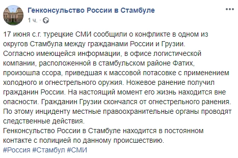 Как сообщает в Facebook Генконсульство РФ в Стамбуле, вечером 17 июня турецкие СМИ распространили информацию о конфликте, произошедшем между гражданами России и Грузии в офисе логистической компании, расположенной в районе Фатих.