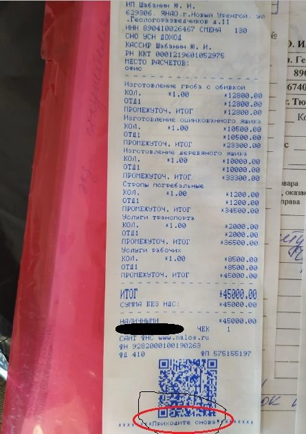 Жительница Нового Уренгоя, недавно похоронившая свою родственницу, с возмущением обнаружила строку «приходите снова» в чеке фирмы ритуальных услуг.
