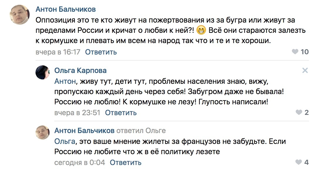 Карпова оставила запись об этом в региональном интернет-сообществе «Подслушано | Нарьян-Мар». Так депутат ответила пользователю по имени Антон Бальчиков, обвинившему оппозиционных политиков в существовании на иностранные средства.