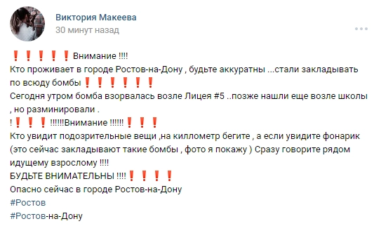 Тем временем в социальных сетях среди ростовчан понемногу нарастает паника. Люди и сообщества делятся памятками о том, как правильно реагировать на подозрительные и бесхозные вещи и что делать в случае обнаружения взрывного устройства.