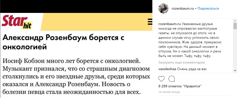 «Ни о какой онкологии и речи быть не может. Тьфу, тьфу, тьфу», — подчеркнул Розенбаум, прикрепив к своему посту сообщение одного из изданий о своем заболевании.