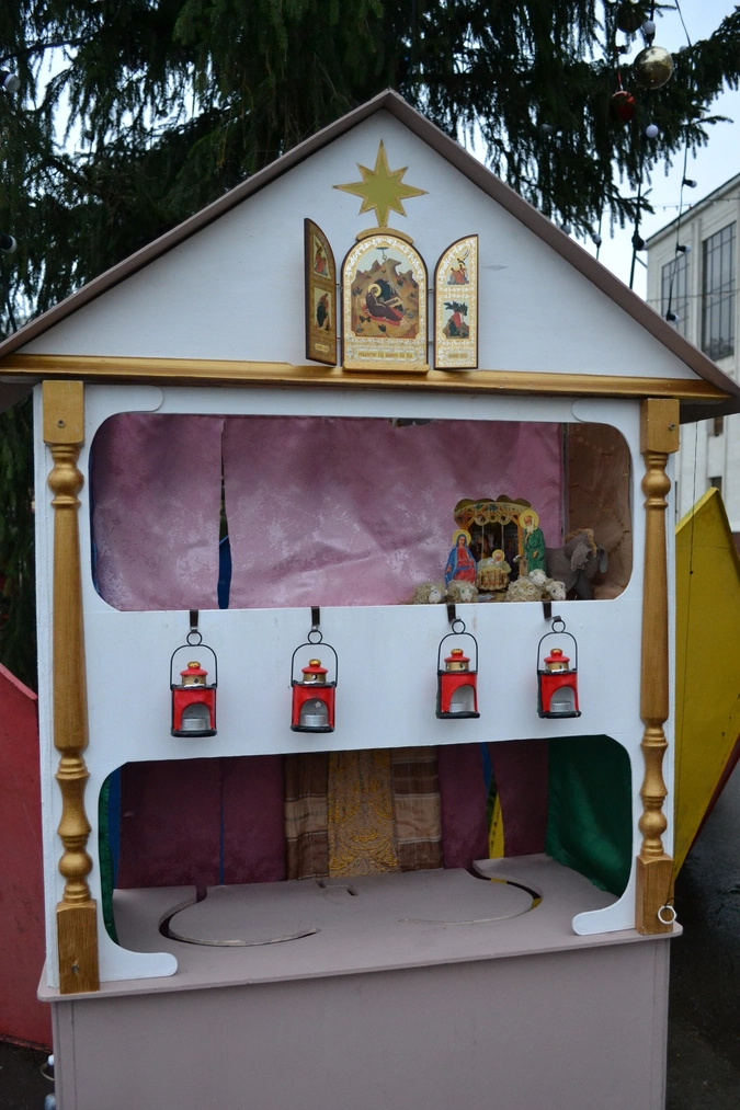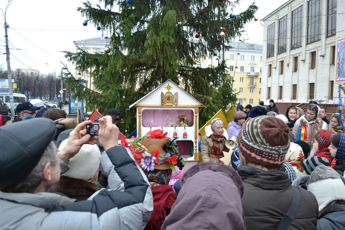 Люди приходили семьями. Для маленьких гостей было показано представление народного кукольного театра – Вертепа. Вертеп – это двухъярусный деревянный ящик, в котором закреплены на проволоках куклы. Представления в Вертепах чаще всего ставятся по религиозным сюжетам, маленькие ярославцы увидели постановку Рождества Спасителя.