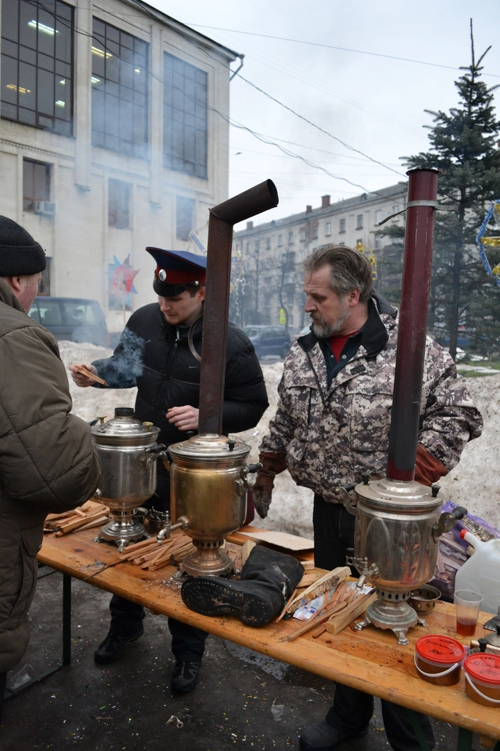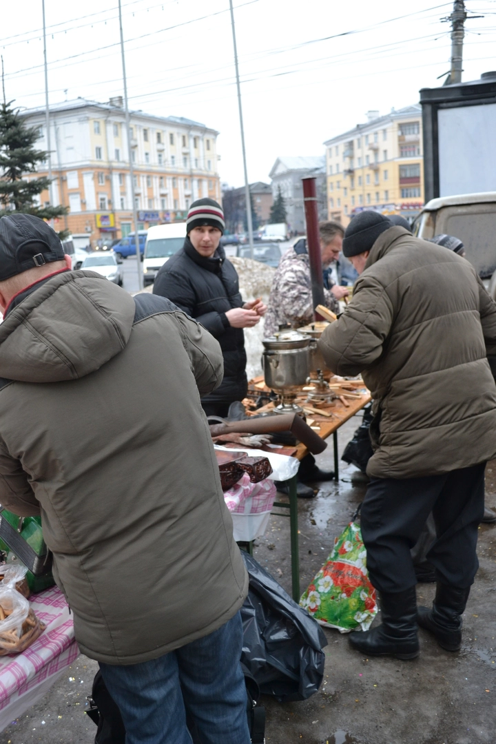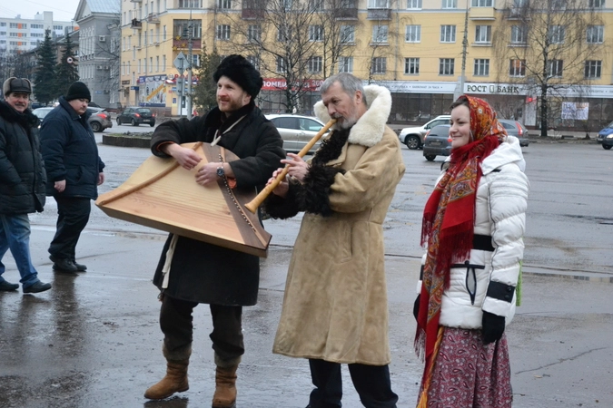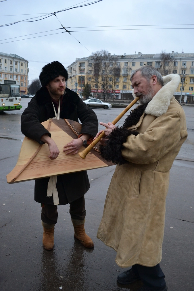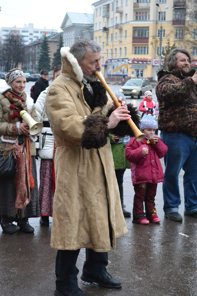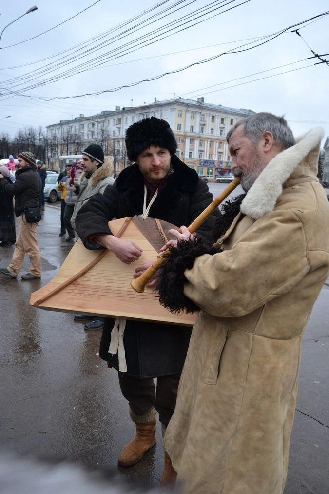 Всё происходившее сопровождалось частушками, шутками и живой музыкой, исполняемой на гармони, флейтах, рожках и гуслях. Любой желающий мог согреться, выпив горячего чая из самовара, который, по традиции, раздувался сапогом, и угостившись чем-нибудь сладким с общинного стола, на который каждый приносил своё угощение.