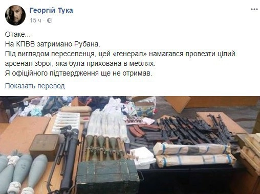 Замминистра по вопросам временно оккупированных территорий Украины Георгий Тука рассказал на своей странице в Facebook, что Рубан «под видом переселенца» пытался перевезти целый арсенал оружия (в том числе минометы), которое было спрятано в мебели.