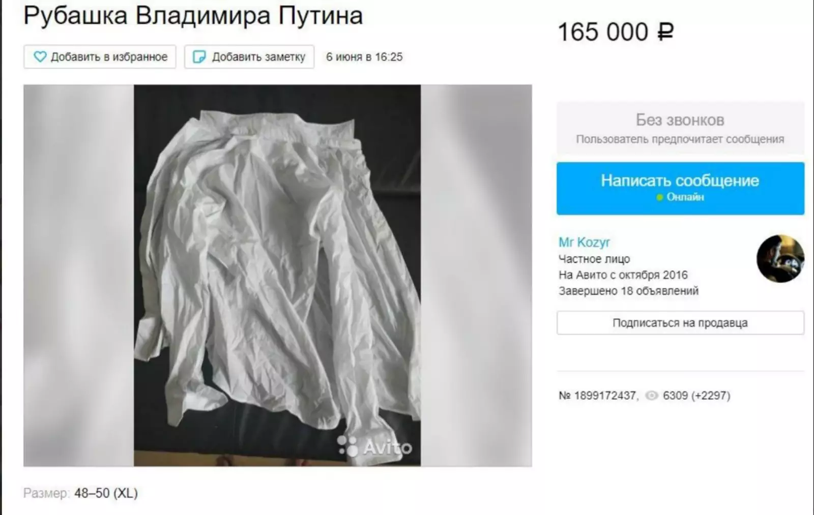 В июне 2020 года неизвестный мужчина под ником Mr Kozyr выложил на «Авито» объявление о продаже рубашки президента России Владимира Путина. За эту вещь он назначил цену в 160 тысяч рублей. Как объяснил автор объявления, его знакомый вынес рубашку «очень нестандартным способом» из отеля Sheraton в Нижнем Новгороде после визита главы государства. Mr Kozyr отметил также, что предмет гардероба российского лидера «ни разу не стирали»