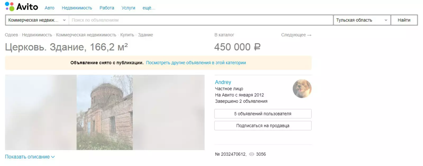 В декабре 2020 года на «Авито» была выставлена на продажу заброшенная церковь середины XIX века в селе Завалово Тульской области, раньше использовавшаяся как склад. Продавец — некий Андрей — предлагал приобрести церковь и прилегающий участок земли общей площадью более 166 квадратных метров за 450 тысяч рублей. Но к 21 декабря объявление уже было снято с публикации. Местная епархия РПЦ инициировала проверку действий продавца.