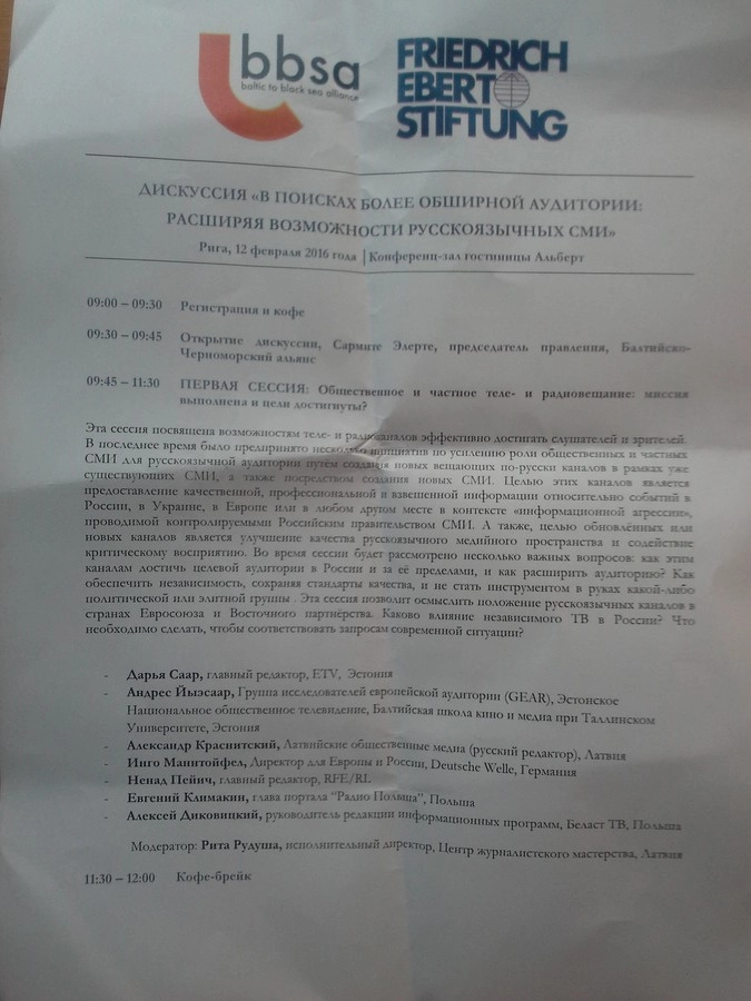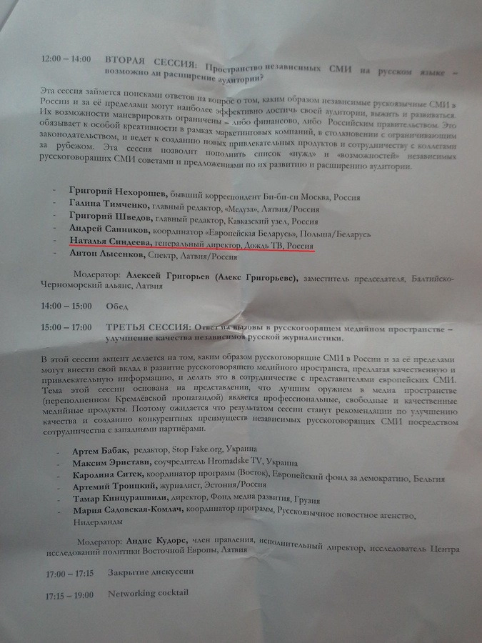 Кроме того, поделиться опытом с представителями «правильных» европейских СМИ, работающих на российскую аудиторию, были приглашены главный редактор издания «Медуза» Галина Тимченко, журналист Артемий Троицкий, сотрудники украинских порталов StopFake и Hromadske. tv, руководство Европейского фонда развития демократии и голландско-польского «Русскоязычного информационного агентства», сообщает ресурс PolitRussia.