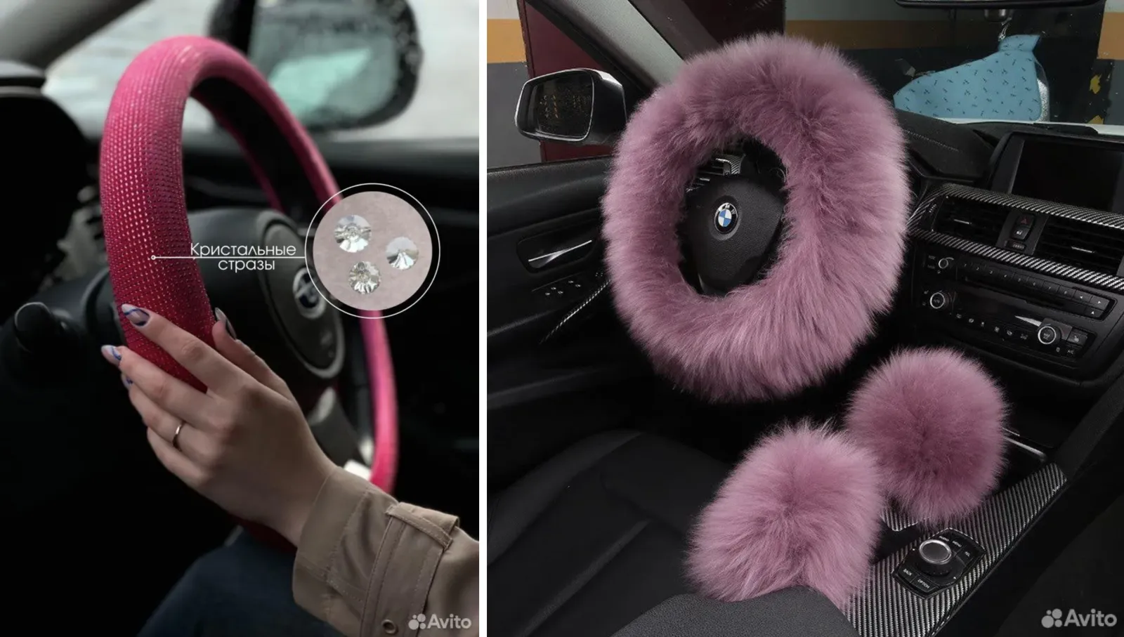 Руль также можно перетянуть или надеть на него специальный чехол. Здесь есть из чего выбрать: оплетка может быть пушистой ярко-розовой или белой либо вовсе украшена стразами — серебристыми или розовыми. Оплетка руля со стразами обойдется в 1 200 рублей, а меховые чехлы можно найти за семьсот рублей.