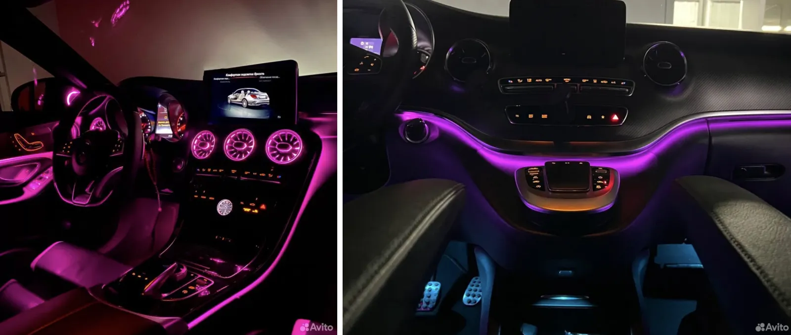 Еще один стильный способ изменить атмосферу в салоне — установить подсветку. Это могут быть светодиодные ленты или неоновые лампы. Популярностью у любителей тюнинга пользуются яркие электрические оттенки, которые особенно эффектно смотрятся во время ночных поездок — Барби бы понравилось.