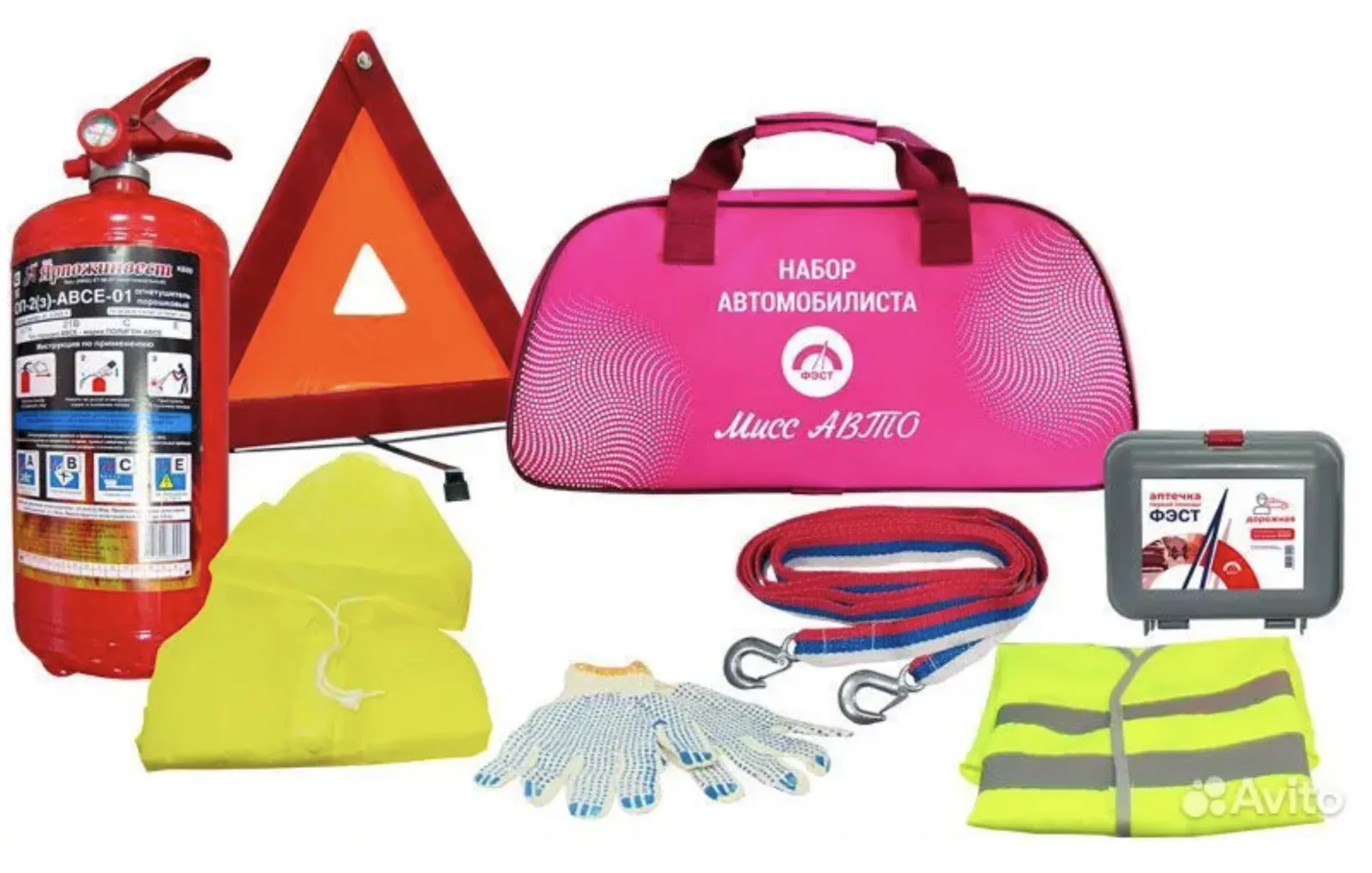 Автомобильный набор для непредвиденных ситуаций должен быть в салоне у каждого водителя. При желании его тоже можно стилизовать. Например, комплект, состоящий из аптечки, огнетушителя, дорожного знака аварийной остановки, буксировочного троса, сигнального жилета, дождевика и перчаток, который продается за 1670 рублей в Москве, может храниться в ярко-розовой сумке.
