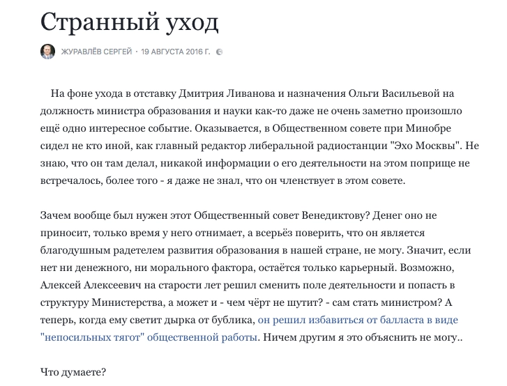 Сегодня, 19 августа, Владимир Путин отправил в отставку самого непопулярного министра России — Дмитрия Ливанова. Большинство россиян с оптимизмом восприняли кадровую перестановку, однако нашлись и те, кому кандидатура Ольги Васильевой пришлась не по нутру. Например, главред «Эха» Алексей Венедиктов поспешил покинуть общественный совет при минобре вслед за Дмитрием Ливановым.