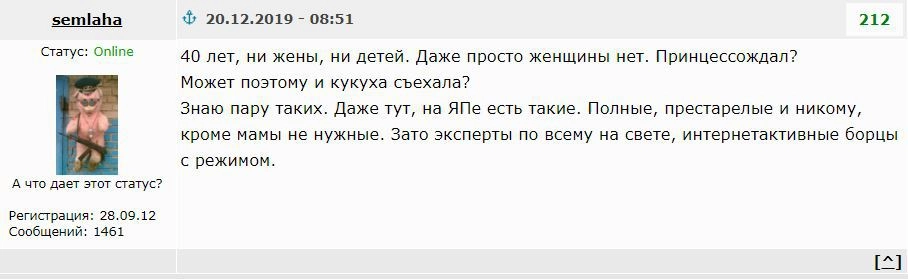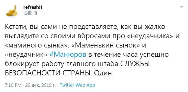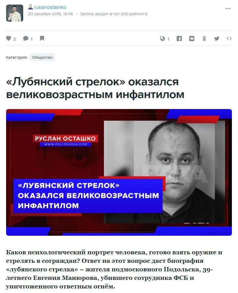 «Убитый Евгений Манюров был неудачником. Не спешите кричать, что это не факт. Я сейчас обосную. 39-летний мужик, то есть на год младше меня, в последнее время не имел ни работы, ни личной жизни. Это слова его родителей», — написал в своем «Живом Журнале» политтехнолог Руслан Осташко. Также он окрестил стрелка с Лубянки «великовозрастным инфантилом».