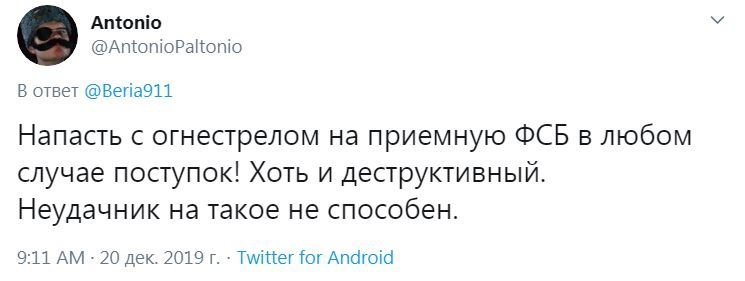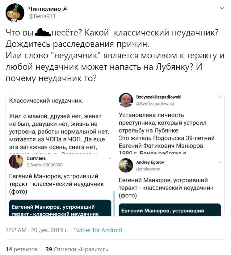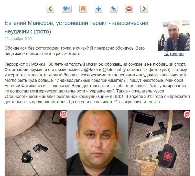 Как сообщал «Ридус», после появления первых новостей о стрельбе на Лубянке 19 декабря, очень противоречивых, реакция блогеров была иной — болезненной, испуганной и злорадной. В то же время, эксперты положительно оценили действия силовиков.