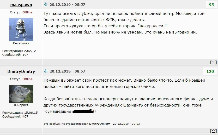 Эту точку зрения поддержали многие блогеры, включая дизайнера Артемия Лебедева, однако в комментариях по поводу уничижительных оценок в адрес Манюрова разгорелась дискуссия. Некоторые посчитали, что стрелком двигали протестные настроения, в противном случае он бы не выбрал своей целью штаб-квартиру ФСБ в день пресс-конференции президента и накануне Дня работника госбезопасности.