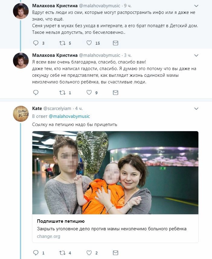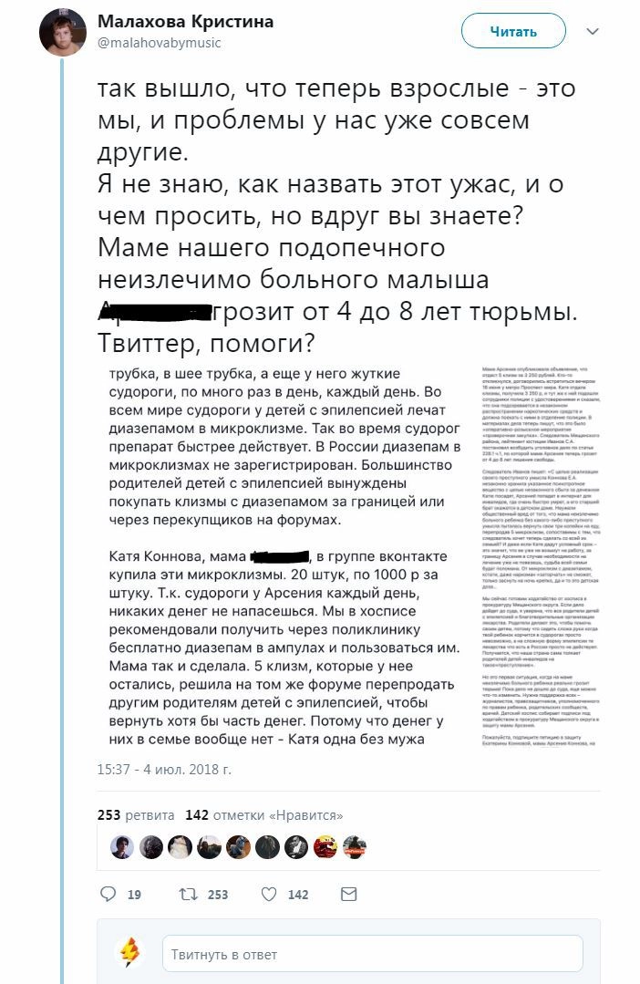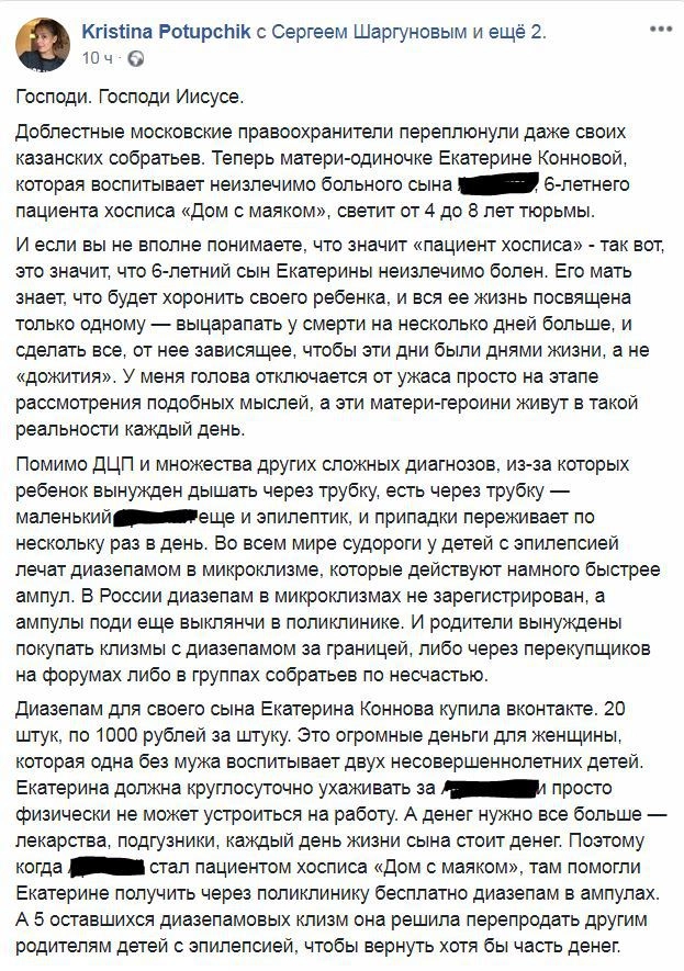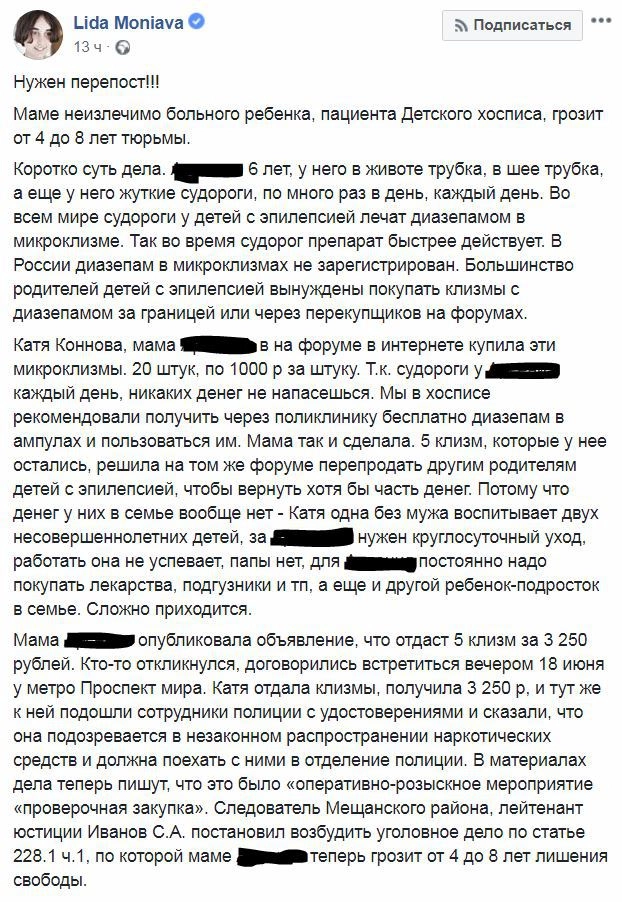«Если Катю посадят, [ребенок] попадет в интернат для инвалидов, где очень быстро умрет, а его старший брат окажется в детском доме. Неужели общественный вред от того, что мама неизлечимо больного ребенка без какого-либо преступного умысла пыталась вернуть свои три копейки на еду, перепродав 5 микроклизм, сопоставимы с тем, что следователь хочет теперь сделать со всей их семьей?», — ужасается в Фейсбуке активистка Лидия Мониава.