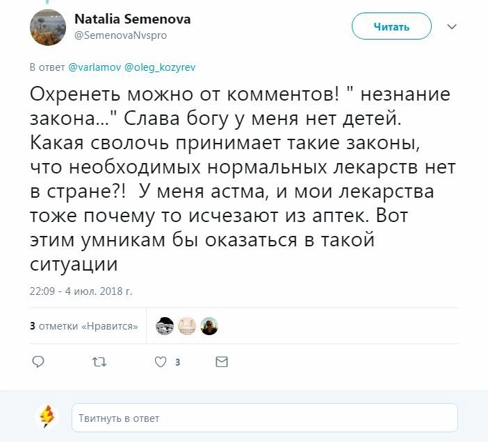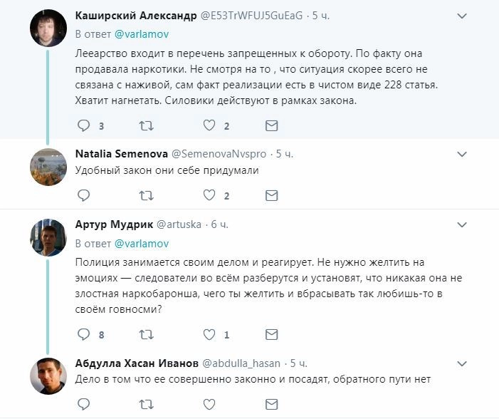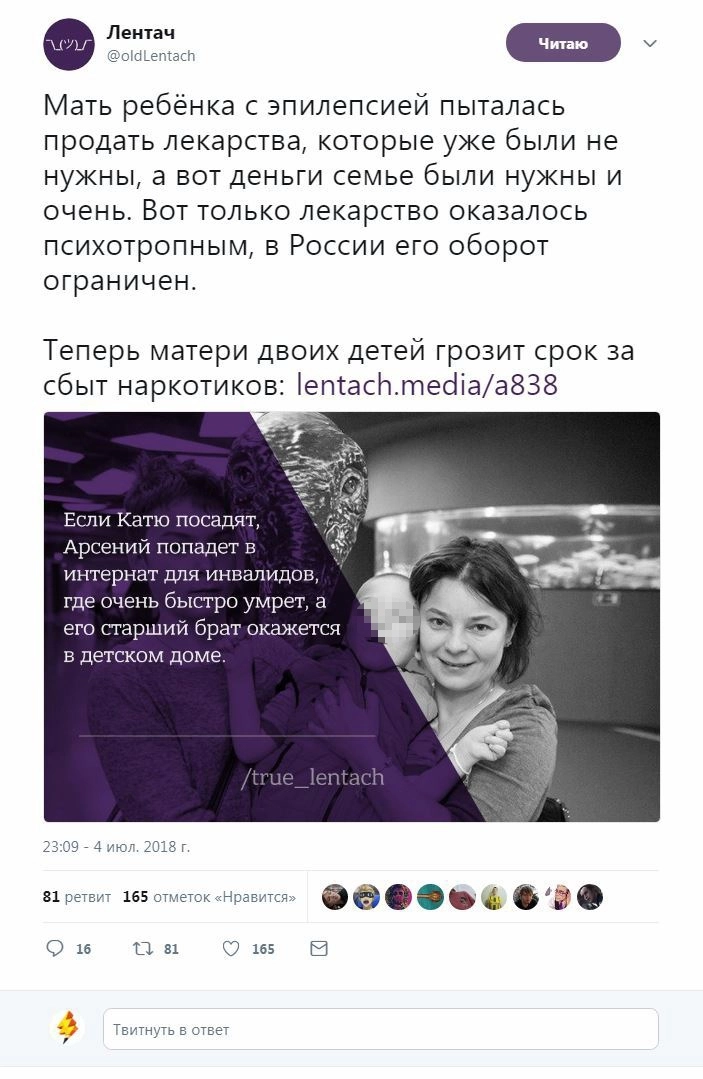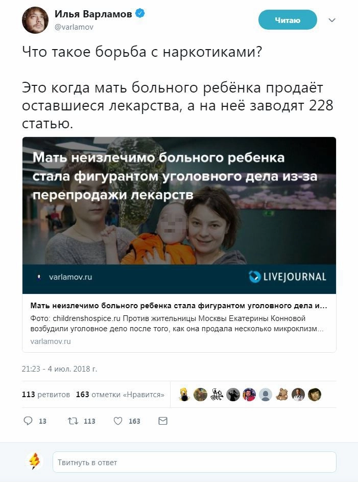 «Что такое борьба с наркотиками? Это когда мать больного ребёнка продает оставшиеся лекарства, а на нее заводят 228 статью», — негодует в Твиттере блогер Илья Варламов.