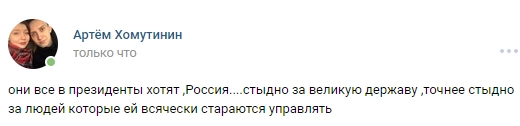 «Они все в президенты хотят, Россия… Стыдно за великую державу, точнее стыдно за людей, которые ей всячески стараются управлять», — написал еще один мужчина.
