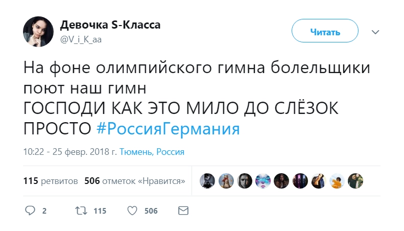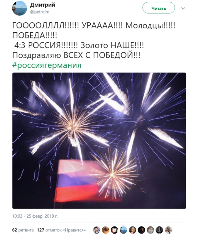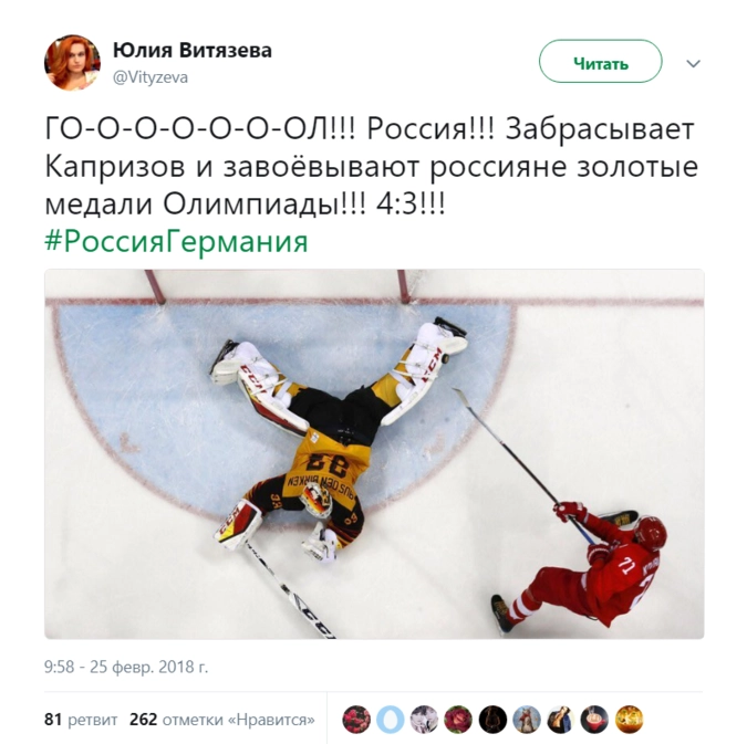 Миллионы россиян ликуют после победы российских хоккеистов над сборной Германии в финальном матче Олимпийских игр — 2018, выплескивая эмоции в социальные сети. Рунет буквально ломится от записей, в которых пользователи прославляют команду, поздравляют друг друга и делятся нахлынувшим счастьем.