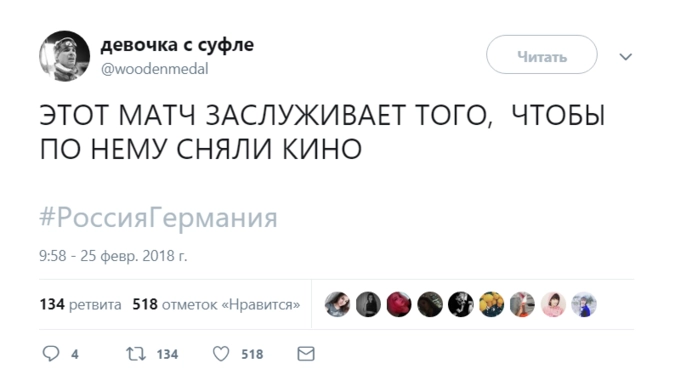 Сетевые шутники подтрунивают над проигравшими немцами. Кроме того, слышны голоса, требующие снять фильм о героической победе российских хоккеистов в условиях беспрецедентного прессинга со стороны Международного олимпийского комитета и пропаганды стран Запада.