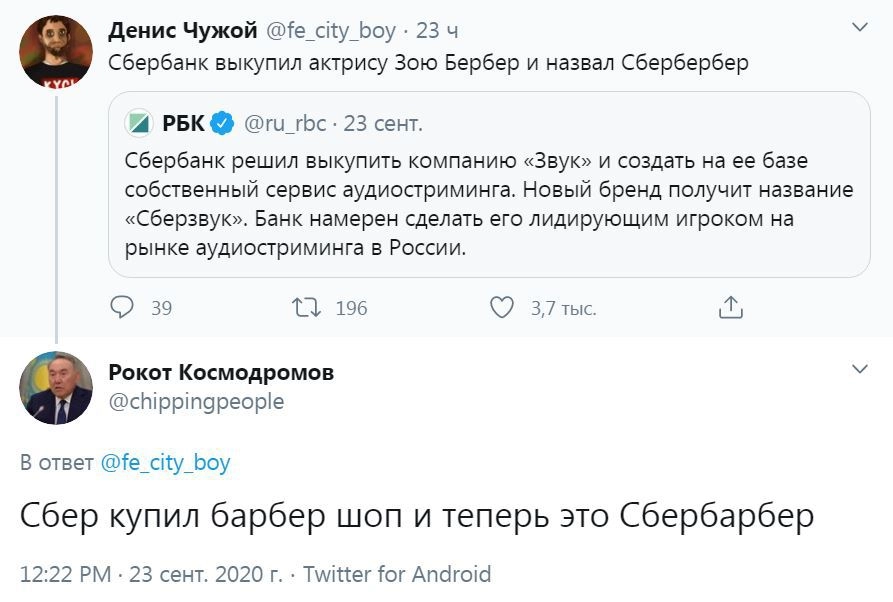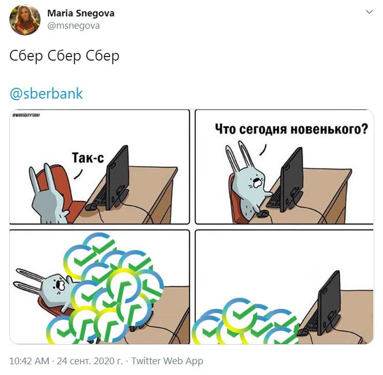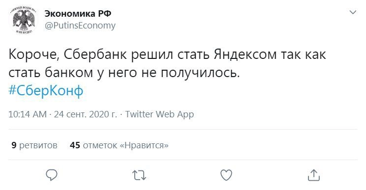 Пользователи Рунета бросились шутить на тему превращения Сбербанка в «Сбер» и презентации его расширенной экосистемы, куда попало более десятка новых сервисов, включая такси и прокат самокатов, доставку еды, развлечения, дистанционное образование и даже услуги почты.