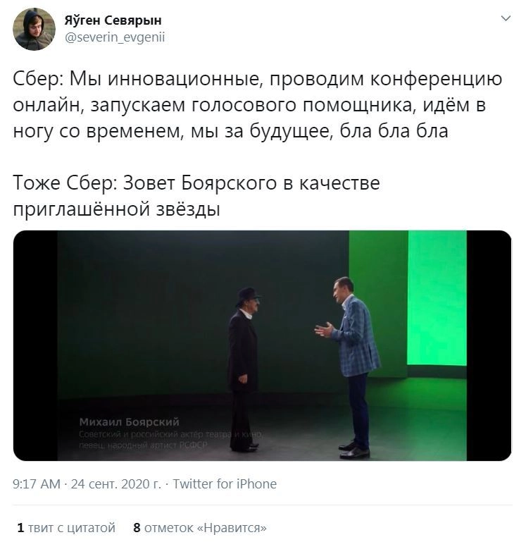 Затем под огнем оказался руководитель «Сбера» Герман Греф, который лично открыл видеопрезентацию новинок. Его заподозрили в попытке копировать стиль топ-менежеров компании Apple Стива Джобса и Тима Кука.