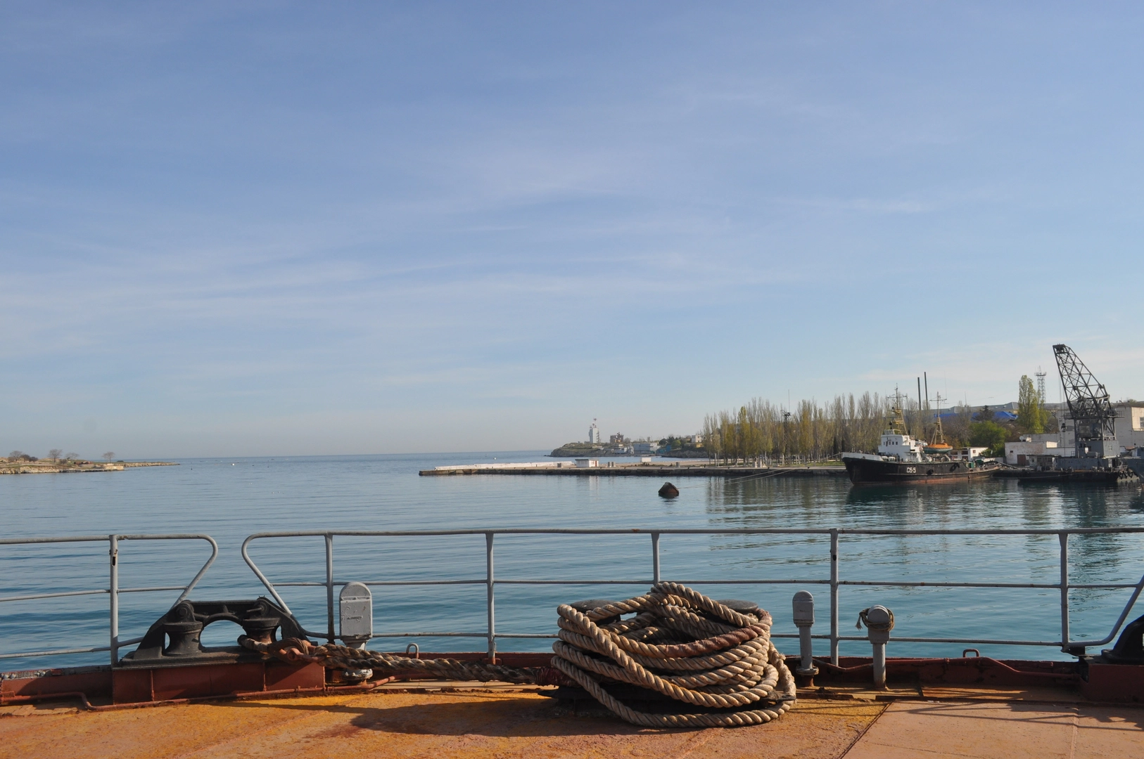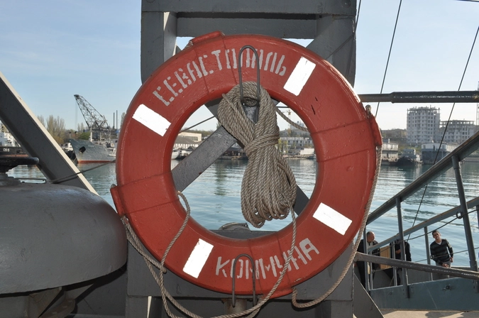 Я отправилась посмотреть, как проходит этот процесс в военной части номер 63876 где располагается отряд спасательных судов ЧФ. Часть находится в Стрелецкой бухте, раньше в ней базировались и украинские, и русские суда. Теперь у причалов нет ни одного украинского судна, подлодка "Запорожье" отбуксирована в Южную бухту и ждет отправки в Одессу, а над удивительно уродливым памятником подводнику гордо реет русский стяг.