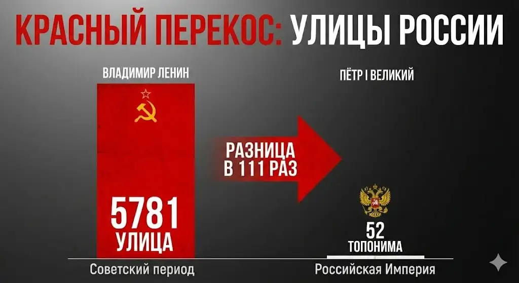 Таким образом, если судить по российским топонимам, то вклад Петра I в российскую историю примерно в 111 раз меньше, чем вклад Ленина. Нечего уж говорить о царе Освободителе и царе победителе Наполеона.