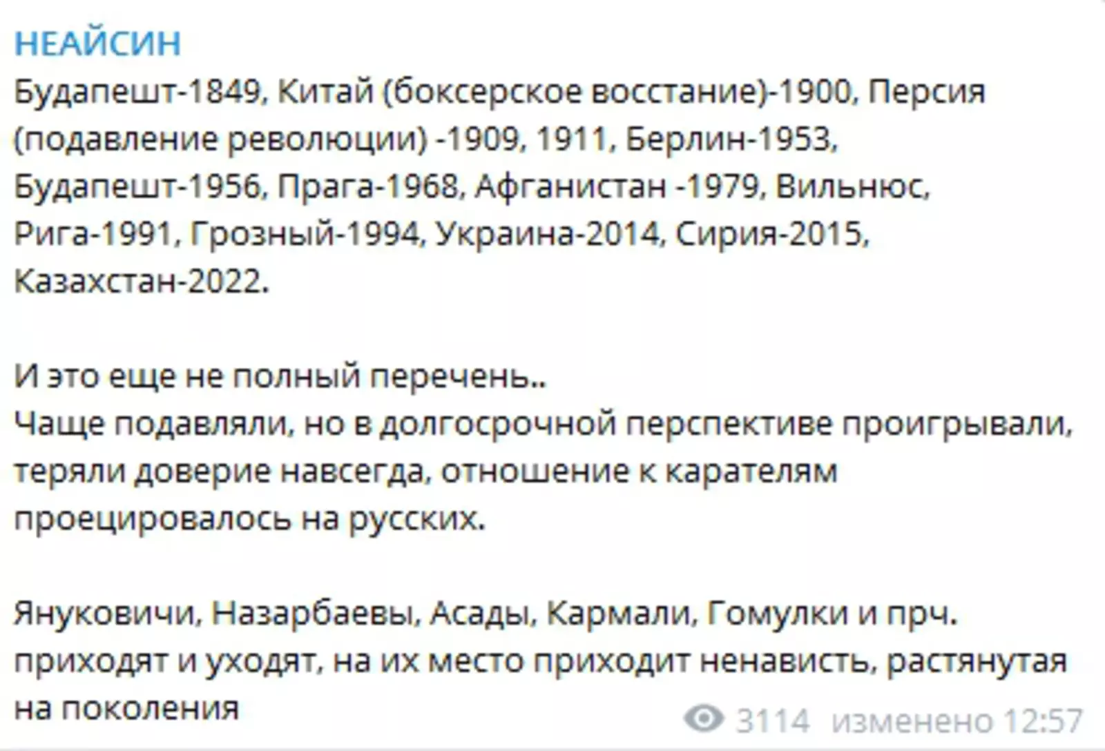«Войска ОДКБ не стреляли по людям, это признают все, кто был на площади. <...> Нет никаких на настоящий момент документальных данных, подтверждающих, что российский контингент применял оружие против протестующих».