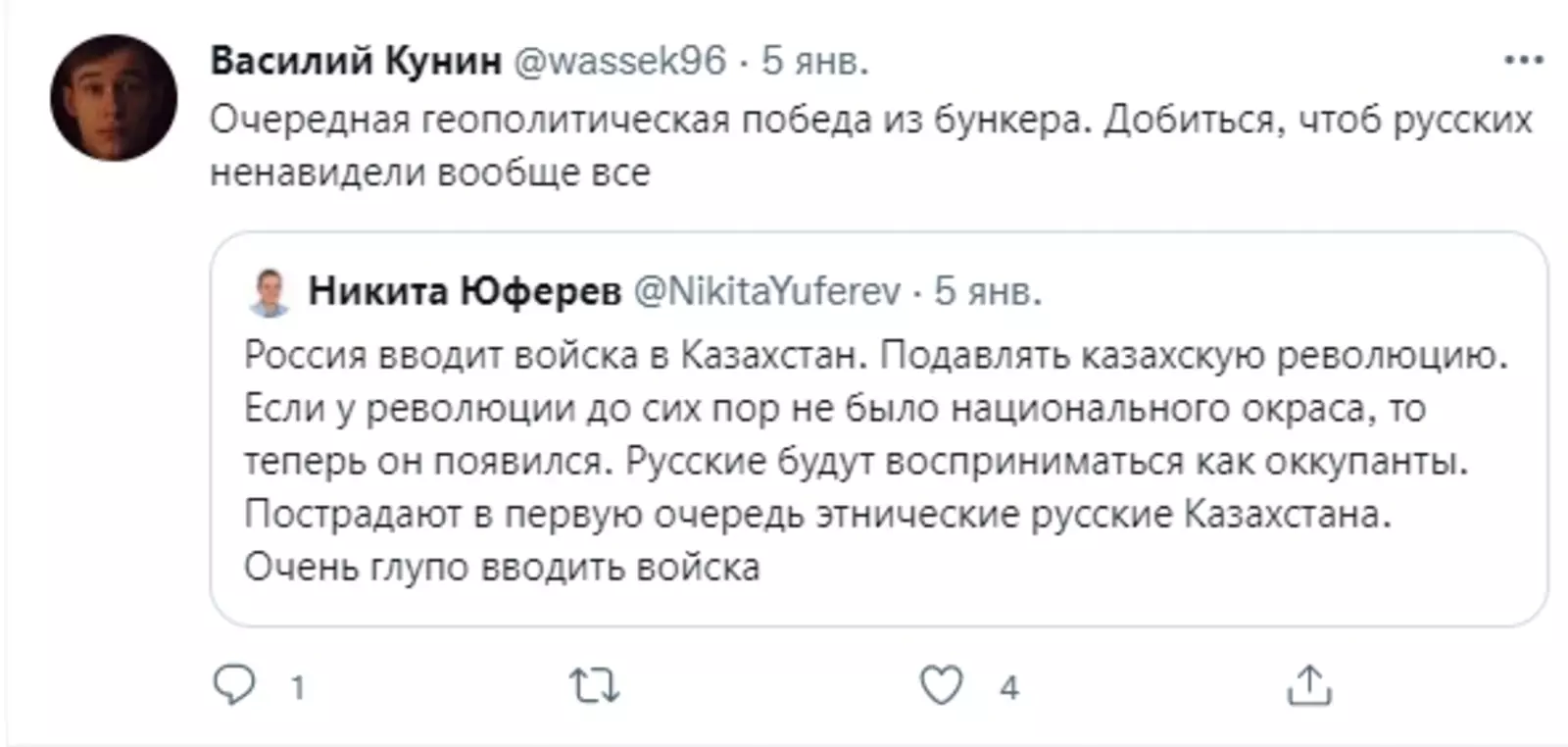 В то же время некоторые респонденты «Ридуса» восприняли миссию ОДКБ как силу, которая смогла защитить их от возможных неприятностей в случае дальнейшего расширения масштабов волнений, и признали, что как минимум в Сети сталкивались с выпадами националистически настроенных казахов, считающих русских, по выражению того же Сергея Дуванова, «квартирантами».