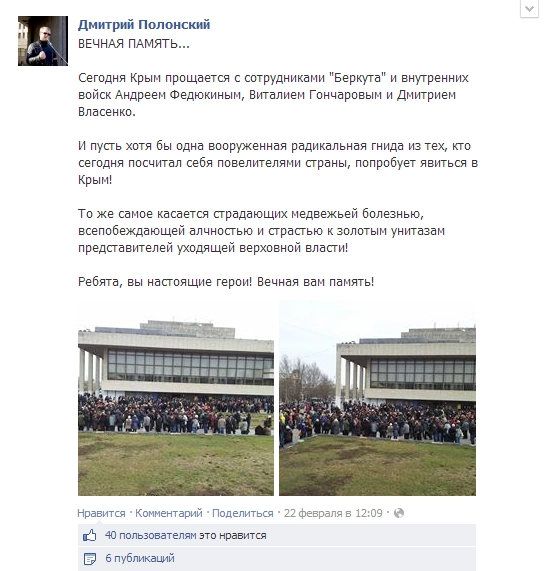 О событиях в русских землях Украины я решил поговорить депутатом симферопольского городского Совета, членом партии "Русское Единство" Дмитрием Полонским.