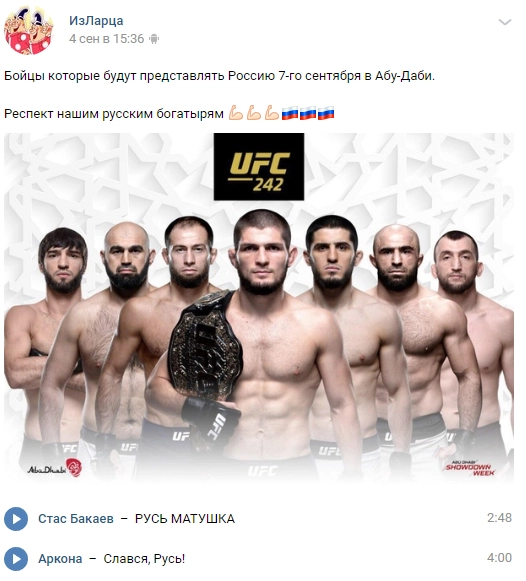 Напомним, группа «ИзЛарца» в соцсети «ВКонтакте» недавно опубликовала афишу с изображением всех российских бойцов. «Респект нашим русским богатырям», — написали авторы публикации и сопроводили ее песнями, посвященными Руси.
